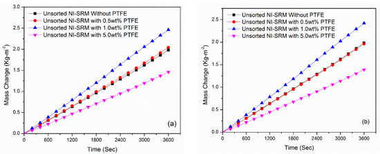 The results revealed that a 0.5 wt% and 500 μL volume of PTFE had poorer evaporation performance than that without PTFE NI-SRM. However, 5.0 wt% had a much poorer evaporation performance than that of 0.5 and 1.0 wt%. The results show that 5.0 wt% PTFE blended with NI-SRM may increase the hydrophobicity, which is the main cause of the reduced water mass.