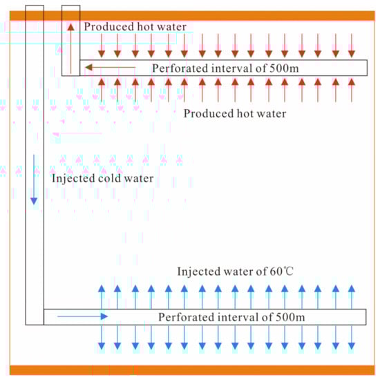 The saturated vapor pressure corresponding to 248 °C is 3.84 MPa, which is far lower than the bottomhole pressure at the production well, which is 5.00 Mpa, so water in the wells and reservoir is all kept as liquid [30]. The initial reservoir temperature is 248 °C, and the initial reservoir pressure is . As stated above, the slight conductive heat exchange between the impermeable cap rock or base rock and the permeable reservoir is neglected, so the boundaries at the top and bottom of the reservoir in Figure 3 are no-flow for mass and heat. Due to symmetry, the left and right boundaries in Figure 3 are also no-flow for mass and heat.