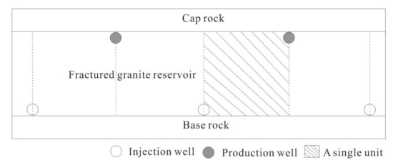 The numerical studies on heat production and electricity generation through vertical wells or horizontal wells at Yangbajing geothermal field show that the performance of using horizontal wells to mine heat from the fractured granite reservoir is more excellent [30,37,38,39]. Therefore, in this study, we take the horizontal well system as an example to investigate the applicable fracture spacing of the EPM method and DPM method at Yangbajing geothermal field. One injection well is located at bottom of the reservoir, and two adjacent production wells are located at top of the reservoir. The injected cold water enters into the fractured reservoir from the injection well, is heated by the fractured rock matrix and then is produced out from the production well, as shown in Figure 1. A suction pump is installed on the ground to draw the heated thermal water out from the reservoir, and the bottomhole production pressure is maintained as constant. We installed an injection pump on the ground directly connected with the injection well, and the water injection rate was maintained as constant [14,38]. This kind of production scheme can effectively lower reservoir pressure and flowing impedance and reduce water loss [14,38]. Because of the thermal contraction of the rock, during the production time, the fracture aperture will increase with time. However, degradation of fractures due to chemical scaling will cause a decrease in the fracture aperture. Previous studies have proved that these two opposite effects are equally possible [15]. Therefore, in this work, we have assumed that after stimulation the fracture characteristics remain unchanged over the heat production time, and thus the fracture propagation and fracture fluid effects are neglected in this study [15]. For simplification, we neglected the water loss in this study and assumed that the water production rate is equal to the water injection rate: q = qinj = qpro [14]. The governing equation for mass conservation is as follows: