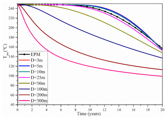 Figure 4 shows the evolution of production temperature Tpro for the EPM method and the MINC method. For the MINC method, the investigated fracture spacings are 3, 5, 10, 25, 50, 100, 200 and 300 m, while the other conditions are the same as those for the EPM method. The corresponding relationships of the porosity and permeability between the EPM method and MINC method are determined by Equations (1) and (2). Figure 4 indicates that when using the EPM method, the Tpro during the 20 years is within 248.00–156.96 °C. Using the MINC method, when the fracture spacing is 3, 5, 10 and 25 m, the Tpro is within 248.00–153.51 °C, 248.00–153.51 °C, 248.00–153.48 °C and 248.00–152.33 °C, respectively. Therefore, when the fracture spacing D is within 3–25 m, the Tpro values found with the EPM method are basically in the same levels as those of the MINC method. When D increases to be 50, 100, 200 and 300 m, the corresponding Tpro during the 20 years is within 248.00–147.82 °C, 248.00–136.99 °C, 248.00–112.82 °C and 248.00–99.11 °C, respectively. Therefore, when fracture spacing is within 25–300 m, with the increase in the fracture spacing, the difference in Tpro between the EPM method and the MINC method gradually increases; thus, when D is larger than 25 m, we should use the MINC method to simulate the fractured reservoirs, and the EPM method is not reasonable under this condition. Besides, Figure 4 shows that with the increase in D, the duration of the stable stage gradually decreases, the duration of the declining stage gradually increases and the declining rate of Tpro during the declining stage gradually increases. This is because higher D effectively reduces the heat transfer area between the water and the rock, and this will obviously decrease the thermal power according to the heat transfer formula of convection and thus decrease the Tpro. This is consistent with results from Sanyal et al. using the DPM method [15].