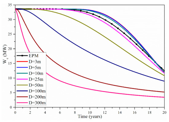 Figure 5 shows the evolution of the electric power We of the EPM method and the MINC method. During the 20 years, using the EPM method, the We is within 33.61–12.50 MW. Using the MINC method, when the fracture spacing is 3, 5, 10 and 25 m, the We is within 33.62–11.86 MW, 33.62–11.86 MW, 33.63–11.85 MW and 33.6–11.64 MW, respectively. Therefore when D is within 3–25 m, the difference in We between the EPM method and the MINC method is very small; thus, under this condition, we can use the EPM method to simulate the fractured geothermal reservoirs. When D increases to be 50, 100, 200 and 300 m, the corresponding We during the 20 years is within 33.63–10.82 MW, 33.63–8.93 MW, 33.63–5.22 MW and 33.63–3.44 MW, respectively. Therefore, when D is within 25–300 m, with the increase in D, the difference in We between the EPM method and the MINC method gradually increases; thus, when D is within 25–300 m, it is unreasonable to use the EPM method to model the fractured geothermal reservoirs. With the increase in fracture spacing, the heat conduction in the rock mass becomes predominant and the heat convection in the fracture water becomes secondary. The MINC method can carefully consider the heat conduction in the rock mass; in this method, the pressure and temperature changes in the matrix are controlled locally by the distance from the fractures. Thus, for greater fracture spacing, the MINC method is more suitable. For smaller fracture spacing, the heat convection in the fracture water is predominant and the heat conduction is secondary; thus, both the EPM method and the MINC method are suitable. Besides, Figure 5 also shows that during the stable stage, the We basically remains unchanged with the increase in D; during the declining stage, the rate of decline in We gradually increases with the increase in D. As stated above, this is because higher D obviously reduces the heat transfer area between the rock and water, and this will obviously decrease the thermal power and the electric power [14].