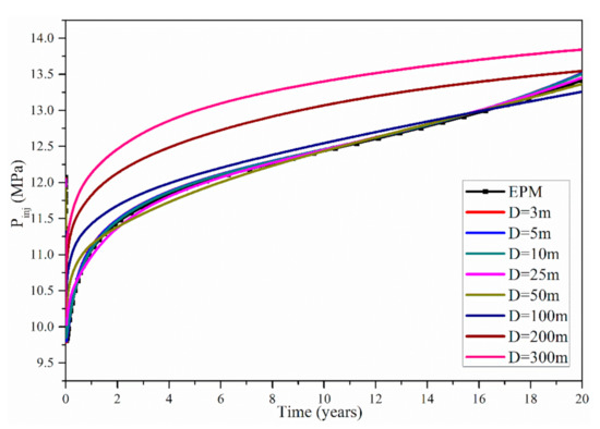 Figure 6 shows the evolution of the injection pressure Pinj of the EPM method and the MINC method. Using the EPM method, during the 20 years, the injection pressure Pinj is within 9.81–13.42 MPa. Using the MINC method, when the fracture spacing is 3, 5, 10 and 25 m, the Pinj is within 9.78–13.52 MPa, 9.80–13.52 MPa, 9.85–13.51 MPa and 10.03–13.45 MPa, respectively. Therefore, when D is within 3–35 m, the results of the EPM method are in the same levels as those of the MINC method, and under this condition, we can use the EPM method to simulate the fractured geothermal reservoirs. However, when D increases to be 50, 100, 200 and 300 m, the corresponding Pinj during the 20 years is within 10.27–13.36 MPa, 10.42–13.26 MPa, 10.36–13.55 MPa and 10.15–13.84 MPa, respectively. Therefore, when D is within 25–300 m, the difference in Pinj between the EPM method and the MINC method increases with the increase in D; thus, under this condition, it is unreasonable to use the EPM method to model the fractured geothermal reservoirs. Besides, Figure 6 shows that the Pinj gradually increases with time. This is because as reservoir temperature gradually decreases, the water temperature in the reservoir also decreases with time, and this causes a gradual increase in water viscosity and an increase in reservoir impedance. This effect has been clearly stated in a previous study from Zeng et al. [14].
