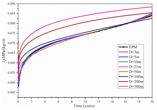 The reservoir impedance is calculated by the equation in [14]. represents the power consumption of the unit production rate for penetrating the fractured reservoir, = P0 = 5.00 MPa is the bottomhole production pressure and q0 = 50q = 100.0 kg/s is the water production rate between the injection well and the production well. Figure 7 shows the evolution of the reservoir impedance of the EPM method and the MINC method. Using the EPM method, during the 20 years, the is within 0.048–0.084 MPa/(kg/s). Using the MINC method, when the fracture spacing is 3, 5, 10 and 25 m, the is within 0.048–0.085 MPa/(kg/s), 0.048–0.085 MPa/(kg/s), 0.049–0.085 MPa/(kg/s) and 0.050–0.085 MPa/(kg/s), respectively. Therefore, when D is within 3–25 m, the results of the EPM method are basically in the same levels as those of the MINC method, and under this condition, we can use the EPM method to model the fractured geothermal reservoirs. However, when D increases to be 50, 100, 200 and 300 m, the corresponding during the 20 years is within 0.053–0.084 MPa/(kg/s), 0.05–0.083 MPa/(kg/s), 0.054–0.085 MPa/(kg/s) and 0.051–0.088 MPa/(kg/s), respectively. Therefore when D is within 25–300 m, with the increase in D, the difference in IR between the EPM method and the MINC method gradually increases, and under this condition, it is unreasonable to use the EPM method to model the fractured geothermal reservoirs. Besides, as mentioned above, Figure 7 also shows that during the 20 years the gradually increases with time, which is caused by the increase in water viscosity caused by the decline in reservoir temperature [14].