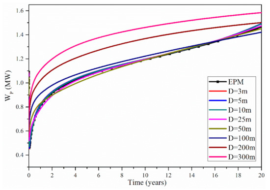 The internal energy consumption of the pump power can be calculated by the equation in [14]. The water density varies with pressure and temperature, and this will significantly impact the calculation of [14]. The average value of the minimum density and maximum density is used for computations in this study [14]. The maximum density is 989.0 kg/m3, and the minimum density is 804.0 kg/m3; thus, the average value of = 896.5 kg/m3 is adopted for calculations. Figure 8 shows the evolution of the pump power of the EPM method and the MINC method. Using the EPM method, during the 20 years, the is within 0.46–1.47 MW. Using the MINC method, when the fracture spacing is 3, 5, 10 and 25 m, the is within 0.45–1.49 MW, 0.46–1.49 MW, 0.47–1.49 MW and 0.52–1.47 MW, respectively. Therefore, when D is within 3–25 m, the results of the EPM method are in the same levels as those of the MINC method; thus, under this condition, the EPM method can be used to model the fractured geothermal reservoirs. However, when D increases to be 50, 100, 200 and 300 m, the corresponding during the 20 years is within 0.59–1.45 MW, 0.63–1.42 MW, 0.61–1.50 MW and 0.56–1.58 MW, respectively. Therefore, when D is within 25–300 m, with the increase in D, the difference in between the EPM method and the MINC method gradually increases, and under this condition, it is unreasonable to use the EPM method to model the fractured geothermal reservoirs. Besides, Figure 8 also shows that during the 20 years the gradually increases with time. Based on the equation of in [14], this is caused by the gradual increase in Pinj, and this is in accordance with previous studies [14].
