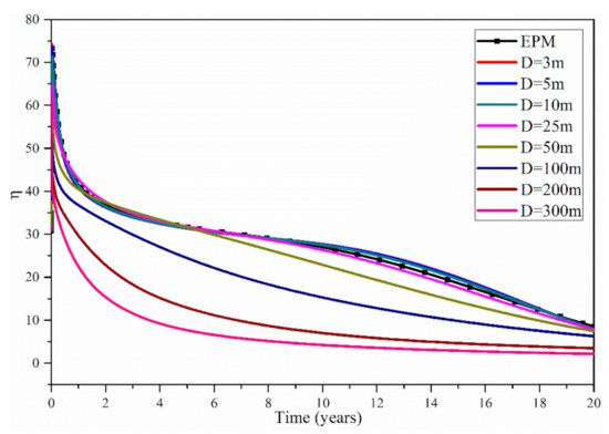 The energy efficiency η of the system can be calculated by the equation in [14]. As stated above, the average value of the water density of = 896.5 kg/m3 is adopted in the calculation of η. Figure 9 shows the evolution of the energy efficiency η of the EPM method and the MINC method. Using the EPM method, during the 20 years, the η is within 73.28–8.53. Using the MINC method, when the fracture spacing is 3, 5, 10 and 25 m, the η is within 74.30–7.94, 73.59–7.94, 71.33–7.95 and 64.61–7.89, respectively. Therefore, when D is within 3–25 m, the results of the EMP method are in accordance with those of the MINC method; under this condition, we can use the EPM method to simulate the fractured geothermal reservoirs. However, when D increases to be 50, 100, 200 and 300 m, the corresponding η during the 20 years is within 57.08–7.46, 53.33–6.29, 54.80–3.48 and 60.82–2.17, respectively. Therefore, when D is within 25–300 m, with the increase in D, the difference in η between the EPM method and the MINC method gradually increases; under this condition, it is unreasonable to use the EPM method to model the fractured geothermal reservoirs. Besides, Figure 9 also shows that during 20 years the η gradually decreases. Based on the equation of η in [14], this is caused by the gradual decline in Tpro and the gradual increase in Pinj, and this is in accordance with a previous study from Zeng et al. [14].