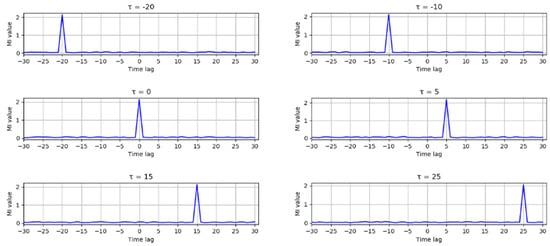where x(t) is a random variable follows a uniform distribution between 0 and 1, and s1 is a random noise that follows a normal distribution with mean 0 and variance 0.02. Another variable y(t) has a nonlinear relationship with x(t − τ), and τ is set to several different values (−20, −10, 0, 5, 15, 25) to test the performance of TDMI. The MI of x and y with a time lag between −30 and 30 is shown in Figure 1, and it can be seen that the MI reaches its peak when the time lag equals to the preset τ in all the six situations. Due to the causal feature of industrial process, only variables changing earlier can possibly be the cause for other variables changing later; therefore, the TDMI can be applied to detect and analyze the causal relationship in nonlinear systems.