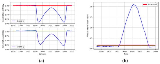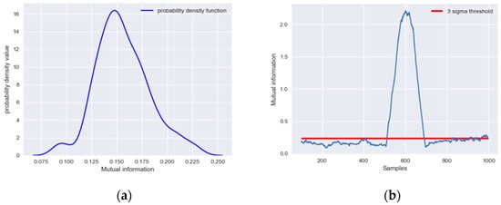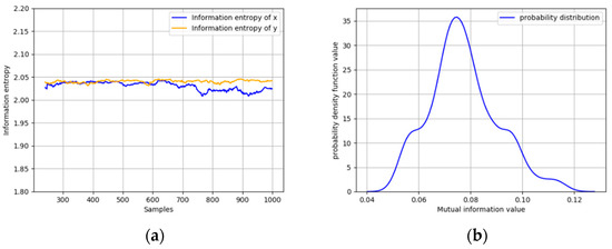 Then, thresholds of IE and MI are determined with the first 1000 normal data. The IE of x and y under normal operating conditions and the distribution of MI of x and y are shown in Figure 6a,b. It can be obtained that the MI follows a normal distribution with mean 0.07728 and standard deviation 0.01315. As discussed before, a three-sigma threshold is selected as 0.15617, and the thresholds of IE are selected in the same way.