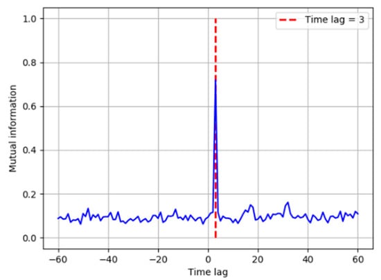 Because of the symmetry in the calculation of MI, it can only reflect the degree of correlation between variables, but the chronological order of information between variable deviations is not available. To overcome this limitation, a time lag parameter can be introduced in the calculation to identify chronological order between variable deviations [19]. The MI with a time lag can be defined as follows: