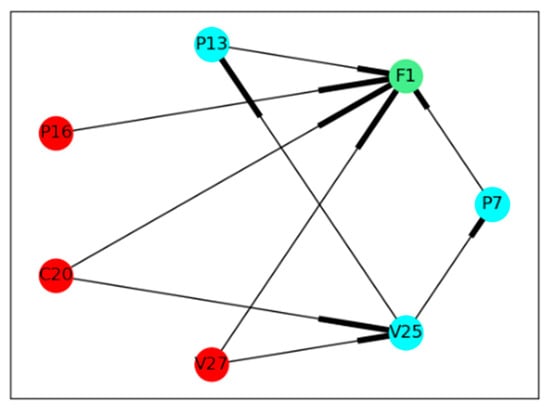 According to literature, a process knowledge based fault diagnosis method and a traditional data based method are referred to compare the results with the proposed method. In Peng Di’s study, the fault diagnosis method is implemented by a probabilistic signed directed graph model constructed from the process flowchart of TEP. The results are shown in Figure 14. It can be observed that the reactor cooling water outlet temperature (Trc) is caused by reactor cooling water flow (V10). However, variable correlation is completely different in a causal model among process variables constructed by a Bayesian network using historical data in Sylvain Verron’s study. Their results are shown in Figure 15, where the change of reactor cooling water flow (X51) is caused by the disturbance of reactor cooling water outlet temperature (X21) [29]. It can be seen that faults 14 and 17 cannot be correctly diagnosed by only one method, as causal relations among variables may change significantly due to different control strategies and operating conditions. By the proposed fault diagnosis method, real-time data are applied to calculate the variable correlation, and, therefore, fault diagnosis results obtained from the proposed method are more objective than previous methods.