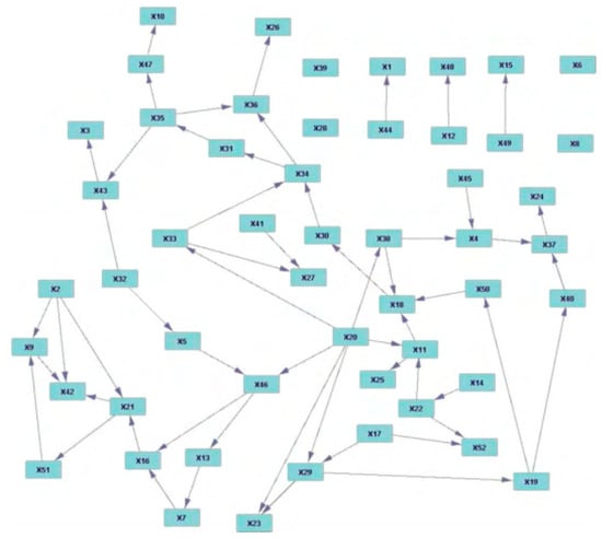 Probabilistic signed digraph of the TE process in Peng Di’s study. Reproduced with permission from [Peng, D.; Gu, X.; Xu, Y.; Zhu, Q.], [Journal of Loss Prevention in the Process Industries]; published by [Elsevier], 2015.