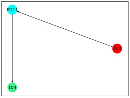 This point of view can be proved by analyzing fault 14. The root cause of fault 14 is the sticking fault in the reactor cooling water flow, the fault is propagated to the reactor temperature using a few minutes according to the fault propagation results in Figure 13a. It takes a certain time for changes in the reactor cooling water flow to affect the reactor temperature because of fluid flow and heat exchange. However, when an abnormal deviation occurs at the reactor temperature, the control system responds immediately to the reactor cooling water valve. The time lag between the reactor temperature and the reactor cooling water flow in fault 11 is zero; therefore, the root cause of fault 11 is the reactor temperature rather than the reactor cooling water flow. It should be noticed that, in practical situations, the reactor temperature cannot be the root cause as a state variable; then, the fault should be located in the cooling water, and, because the reactor cooling water flow is not the root cause, the real root cause of this fault is the cooling water inlet temperature. Because this variable is not measured in this system, the fault is located in the reactor temperature.