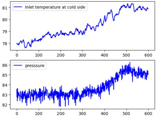 In case two, an abnormal increase of pressure drop is detected again. However, the circulating hydrogen flow stays steady during this time. The fault diagnosis result obtained from the proposed method is shown in Figure 18. It can be concluded that this abnormal increase of pressure drop is caused by inlet temperature at cold side, and then outlet temperature at hot side is further influenced. According to original data in Figure 19, the pressure difference drop at hot side increases at the 350th sample, but inlet temperature at cold side increases as early as the 67th sample, indicating that the fault diagnosis result is correct. The results show that the fault propagation path and the root cause can be identified by the proposed method correctly, and the proposed method can be well applied to industrial processes.
