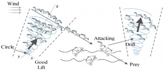Inspired by the migration and attack behavior of seagulls, Dhiman et al. [21] proposed a random search algorithm based on swarm intelligence—seagull optimization algorithm (SOA). When using the seagull optimization algorithm, assume that the size of the seagull population is , the dimension of the problem space is , and the position of the seagull is , . Finally, the migration and attack behavior of seagulls are the process of individual position updating. The seagull migration and attack process are shown in Figure 1.