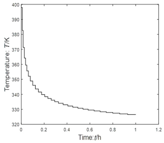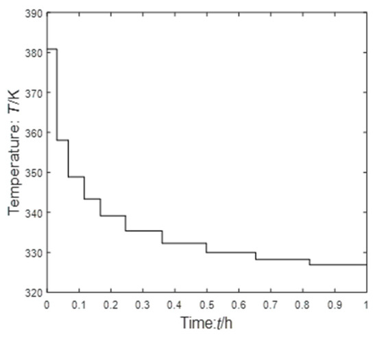 Analysis of the experimental results of Case 1: Table 2 presents results obtained by our ISOA and other methods. The “–” in Table 3 means that the reference did not provide a value. Shi et al. [14] used the PSO-CVP optimization strategy to find the optimal value of 0.6105359. Rajesh et al. [22] used the ant colony structure optimization (ACSO) to obtain the value of 0.61045. Zhang et al. [23] used an iterative ant-colony algorithm (IACA) to obtain values of 0.61 ( = 10) and 0.6104 ( = 20). Logsdon et al. [24] used SQP to obtain the value of 0.610775 ( = 80), which is the best value reported. Renfro et al. [25] used OC to obtain the value of 0.6100. Zhou et al. [26] used a control parameterized particle swarm optimization (CP-PSO) method to obtain the value of 0.6107847, and proposed a control parameterized adaptive particle swarm optimization (CP-APSO) to obtain the value of 0.6107850. Liu et al. [27] proposed improved knowledge-based cultural algorithm (IKBCA) to obtain values of 0.6101 ( = 10), 0.610454 ( = 20) and 0.610779–0.610787 ( = 100). Sun et al. [28] applied hybrid improved genetic algorithm (HIGA) to obtain values of 0.61007 ( = 10), 0.61046 ( = 20). Peng et al. [29] proposed an improved knowledge evolution algorithm (IKEA) to get values of 0.6101 ( = 10), 0.610426 ( = 20), and 0.610781–0.610789 ( = 100), and applied genetic algorithm (GA) to obtain a value of 0.61072. Dadebo et al. [30] used IDP to obtain a value of 0.610775 ( = 80). In this paper, the optimal value of using equal division method is 0.61059223 ( = 30), and the optimal value of unequal division method is 0.610794203 ( = 30). In terms of method execution efficiency, the solution speed of ISOA combined with the equal division method is 272 s, but the solution speed of ISOA combined with the unequal division method is 118 s, and the solution efficiency of the latter is higher. Figure 2, Figure 3 and Figure 4 are the optimal temperature control sequences. Figure 5 is the optimal trajectory of state variables.