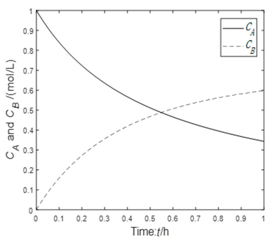The batch reactor is widely used in the process industries. The batch reactor is used for solid dissolution, dissolution, product mixing, chemical reaction, crystallization, etc. A typical batch reactor consists of a tank with an agitator and an integrated heating/cooling system. Liquids and solids are usually charged through a connection port on the top cover of the reactor, vapor and gas are discharged from the top, and liquids and solids are usually discharged from the bottom. In this paper, the reaction process of the batch reactor is →→. is the reaction product, is the intermediate product, and is the product. After the reaction is completed, the concentration of the intermediate product reaches the optimal value. The mathematical model of batch reactor [22] is as follows: