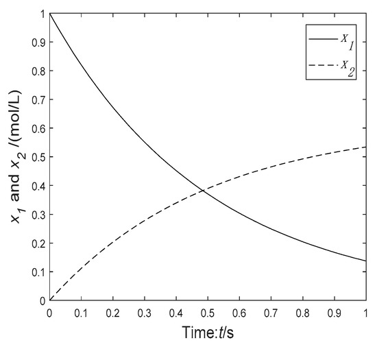 The tubular reactor was proposed by some authors [34,35]. The reaction process is as follows: in a certain length of pipeline, the catalysts and are mixed, and the target product is produced after the reaction is completed. The goal of the problem is to distribute the catalyst in the designated pipeline so that the concentration of the target product reaches the optimal value. The mathematical model of the tubular reactor problem is as follows: