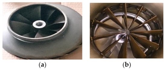 Compressor impeller and inlet guide vanes. (a). Impeller; (b). The IGV at the suction end of the compressor.