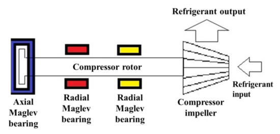 The active magnetic bearing (AMB) is used to replace the traditional bearing in the frequency conversion centrifugal compressor. The AMB can suspend the motor axis in the center of the bearing, forming a friction-free operation. The compressor shaft consists of two groups of radial magnetic bearings and one group of axial magnetic bearings to balance the radial force and axial force generated by the high-speed operation of the compressor shaft, as shown in Figure 3. Because the axis is suspended, the starting current is quite low. Only a small amount of work is needed to start the maglev compressor. At the same time, the low-speed and high-speed gear assembly of the traditional centrifugal compressor is reduced, which greatly reduces the volume and weight of the compressor. The Maglev compressor without high-speed and low-speed gears in the compressor does not need to lubricate the bearings and gears. In the design, all the refrigeration oil circuit systems of the traditional centrifugal compressor are removed, including the oil barrel, oil pump, oil separator, oil filter screen, oil heater, oil pipeline and all the parts and equipment of other refrigeration oil circuit systems, which reduces the volume of the ice water main engine. The operation efficiency is improved, the cost of regular maintenance and replacement of refrigeration oil, oil filter, and oil analysis is saved, and the impact of pollution and waste oil treatment on the environment is also reduced [7].