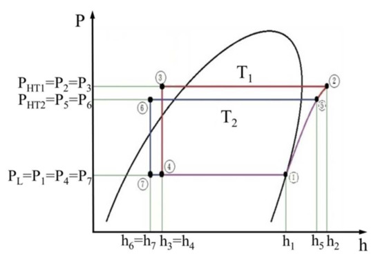 The design condensing pressure of the chiller is point P5; the operation sequence point of the refrigeration cycle is 1→5→6→7→1, as shown in Figure 5; the compressor work is equal to h5 − h1; and the refrigeration capacity of the evaporator is equal to h1 − h7. The COPR of point P5 is shown below.