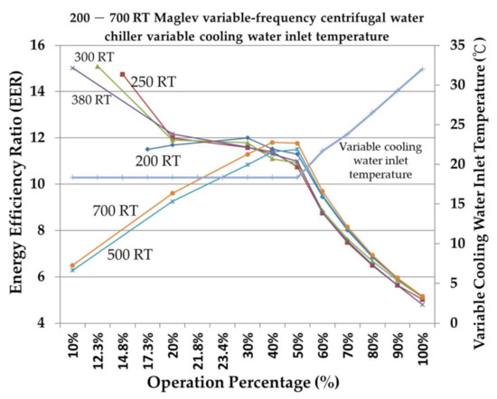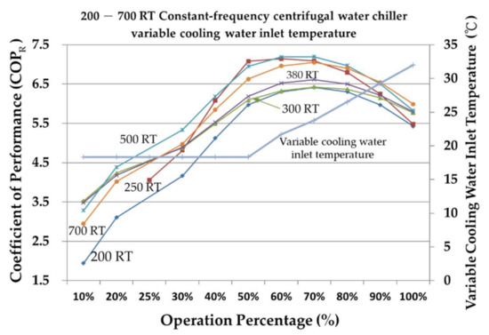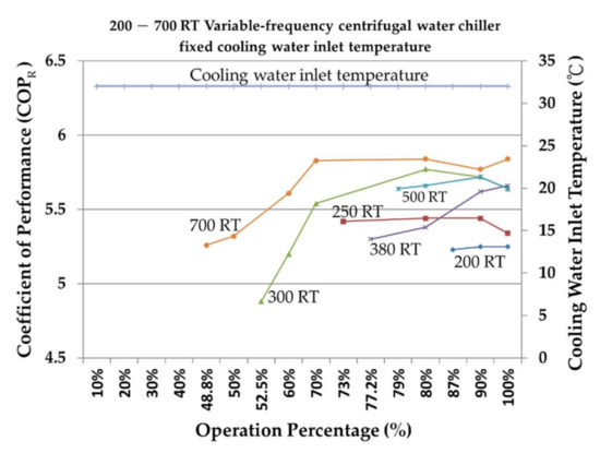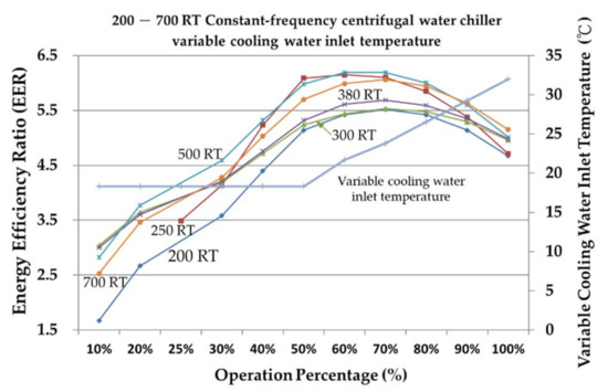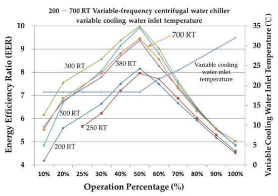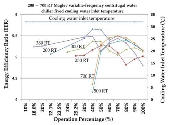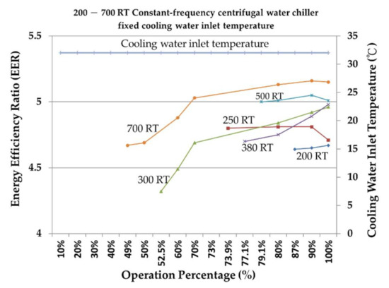 The chiller is one of the most energy-consuming types of air conditioning equipment and often faces problems of overdesign and unnecessary energy consumption due to inadequate maintenance [3]. Analyzing the characteristics of the chiller in relation to the needs of the place where it will be used can help determine the appropriate collocation before purchase, and, after the completion of the construction, ensure that the chiller can be used according to its characteristics to maintain its performance integrity and greatly increase its energy-saving benefit. The cooling coefficient of performance (COPR) and energy efficiency ratio (EER) of the chiller are analyzed. The data of different refrigeration capacities of the centrifugal chiller are calculated using simulation consumer software. Based on different operating percentages and fixed- or variable-cooling water inlet temperature, the energy-saving benefits of the chiller that will greatly increase COPR and EER are discussed. The results of the numerical analysis of different chillers’ refrigeration capacity are used to determine the most favorable operation mode and achieve low-energy consumption and a high-efficiency method. Liu [4] found that the chiller and the motor of the auxiliary equipment of the air conditioner account for most of the power consumption of the central air conditioning system.