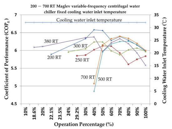 When the inlet cooling water temperature is changed and the full load is 100%, the COPR and EER of the Maglev variable-frequency centrifugal water chiller are better than those of the constant-frequency water chiller, and that of constant-frequency centrifugal water chiller is better than that of variable-frequency centrifugal water chiller. The COPR and EER of the water chiller with time-varying cooling water inlet temperature is better than that with fixed-cooling water inlet temperature under partial-load operation, especially under 70% load operation. The COPR of the Maglev variable-frequency centrifugal chiller can exceed 10, which is quite efficient. The results of the analysis show that the COPR and EER values of various centrifugal water chillers are different during operation. The COPR and EER values of fixed- and variable-cooling water inlet temperatures are very different, especially in partial-load operation, but no substantial difference is observed in full-load operation mode.