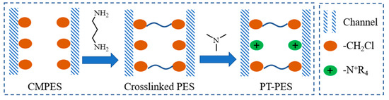 CMPES porous membrane as substrate was simply fabricated via the phase inversion method [27]. The measured amount of CMPES polymer was dissolved in NMP under stirring to form a 25 wt% homogenous solution at room temperature, which was then cast onto the glass plate by a casting knife with a gap of 250 μm. After that, the glass was immediately dipped into a pure water bath to get the CMPES porous membrane substrate. The porous AEMs were prepared via a facile two-step modification of the obtained CMPES porous membrane substrate, which was simply immersed in a 1.5 mol L−1 PDA solution at 40 °C for several hours (1–5 h) to conduct the crosslinking modification, and then immersed in a 1 mol L−1 TMA solution at 60 °C for 12 h to ensure the entire quaternization (See Figure 1). According to the immersing time of CMPES membrane substrate in PDA solution, the obtained AEMs were named PT-PES-Xh (X = 1, 2, 3, 4, 5).