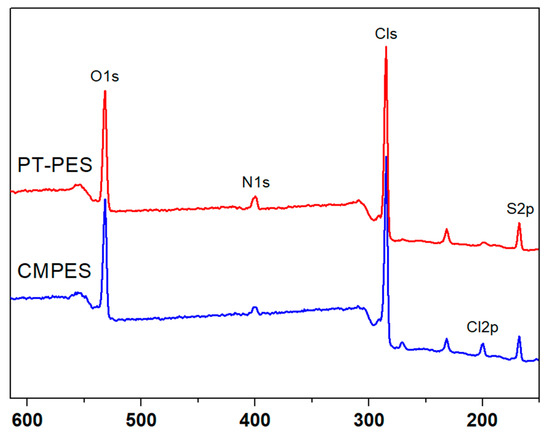 XPS survey spectra of the CMPES substrate and PT-PES-5h AEM.