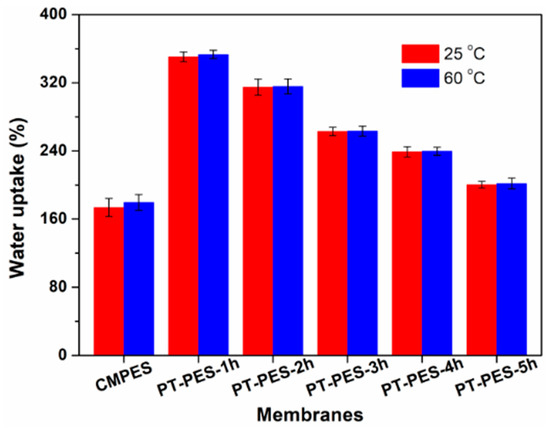 WU values of the CMPES substrate and PT-PES AEMs at 25 and 60 °C are shown in Figure 6. As observed, WU value of the CMPES substrate is 150.3% at 25 °C. From PT-PES-1h AEM to PT-PES-5h AEM, WU values decrease from 350.4% to 200.4%. The reason is due to the decrease in the content of the hydrophilic quaternary ammonium groups (IEC), causing a decline in water absorption in PT-PES AEMs. Generally, WU value of the membrane (e.g., CMPES substrate) at the higher temperature should be higher than that at low temperature, but it is worth remembering that PT-PES AEMs have similar WU values at both 25 and 60 °C. This means that the serious swelling at high temperature can be inhibited for PT-PES AEMs, attributed to the fully crosslinking effect by PDA as the crosslinker. Such phenomena prove the good swelling stability of PT-PES AEMs, and are consistent with our previous work [26].