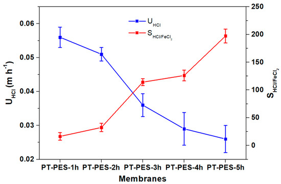 The DD performance of PT-PES AEMS including and are represented in Figure 7. It is that value of CMPES substrate is almost 0 because of the absence of an anion exchange group [25], which is also consistent with the XPS and IEC results. From PT-PES-1h AEM to PT-PES-5h AEM, values of the PT-PES AEMs decrease from 0.056 m h−1 to 0.026 m h−1, while values increase from 16.4 to 197.3. These phenomena can be explained by the physicochemical properties, especially the quaternization degree (IEC) and the membrane morphology. As discussed in the IEC section, from PT-PES-1h AEM to PT-PES-5h AEM, the quaternization degree (IEC) increased, resulting in an increase in ion transport as well as . Moreover, the SEM results revealed that the pore size on the top surface would decrease with the increasing immersion time of PT-PES AEMs in PDA solution, significantly hindering the ion transport through the AEMs. Besides, the hindering effect on ion transport is more definite for Fe2+ than H+, thus leading to the increase in . In other words, the increase in is due to the increase in IEC, and the decrease in is due to the enhanced compactness. In view of the balance of