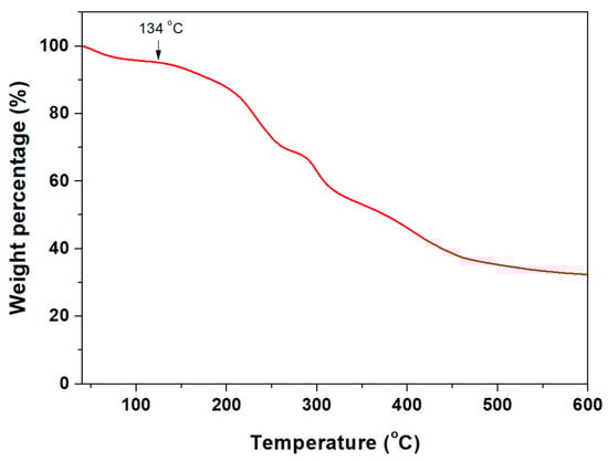 TGA was conducted for the investigation of the thermal stability of PT-PES AEMs. Figure 8 shows the TGA curve of PT-PES-5h AEM. As can be seen, there is a slight weight (~5%) loss when the temperature is below 100 °C, ascribing to the absorbed water evaporation, and can be ignored. Based on this, the starting degradation temperature of PT-PES AEMs when started is about 134 °C, attributed to the weight loss of the charged amine groups in PT-PES AEMs [30]. Since the operating temperature of the DD process is always below 80 °C, PT-PES AEMs therefore possess the desirable thermal stability for the practical application.