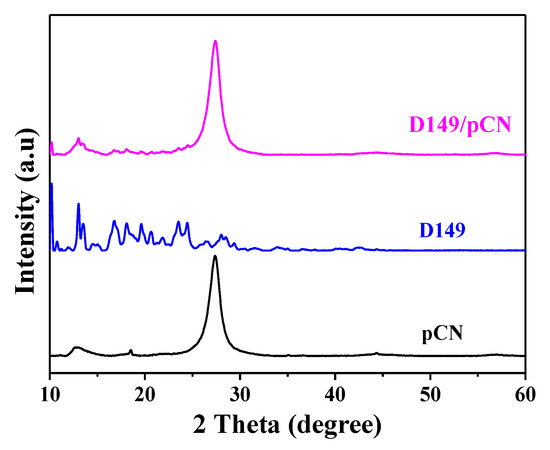 Figure 1 shows XRD patterns. pCN shows peaks at 13.1° and 27.3°, corresponding to the (100) and (002) planes of g-C3N4 (JCPDS No.87-1526), respectively [49]. D149 dye shows a few distinct peaks. D149/pCN shows the peaks of pCN and some tiny peaks corresponding to D149 dye.