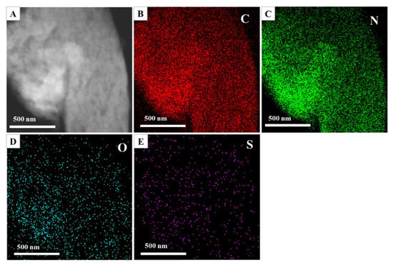 A typical STEM image of D149/pCN (A) and EDX mapping images of C (B), N (C), O (D), and S (E).