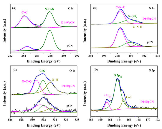 High-resolution XPS data of (A) C 1s, (B) N 1s, (C) O 1s, and (D) S 2p of pCN and D149/pCN.