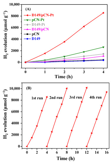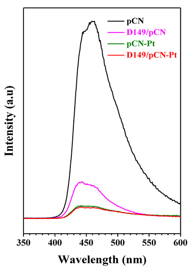 Figure 9 shows the photoluminescence (PL) data. Apparently, the PL intensity of D149/pCN is lower than that of pure pCN, indicating that the recombination of e−-h+ pairs is confined due to the formation of D149/pCN. Furthermore, pCN-Pt and D149/pCN-Pt have much lower emission peaks compared with pCN and D149/pCN, which may be because Pt can not only restrict the recombination of e−-h+ pairs, but also accelerate charge transfer [65,66,67].