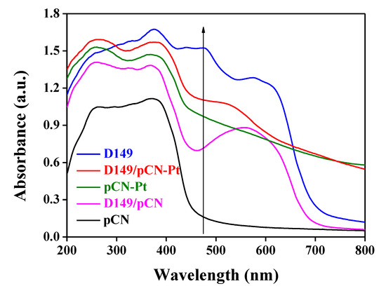 Figure 6 illustrates the UV-vis DRS. The absorption edge of pCN is located at 470 nm. Loading D149 onto pCN could distinctly boost the intensity of visible light absorption. Furthermore, the catalysts with Pt as a co-catalyst show stronger capacity of visible light absorption compared with those samples without Pt [26,42]. Additionally, there is an uplift from 450~700 nm in absorption line of D149/pCN. When Pt is loaded onto D149/pCN, the uplift decreases. This phenomenon is consistent with XRD results, showing the loss of some D149 (Figure S9).