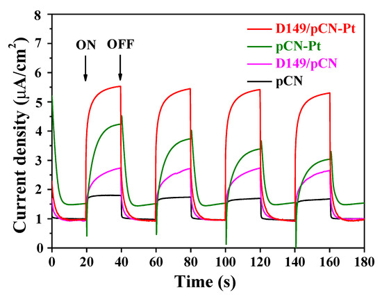 Transient photocurrent density of pCN, D149/pCN, pCN-Pt, and D149/pCN-Pt.