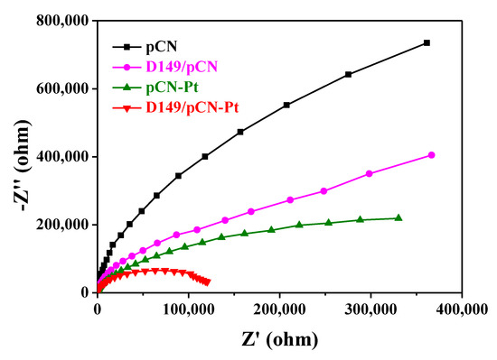 Figure 8 shows the EIS data. Smaller relative radius of the arcs can accelerate electrons transfer and make better separation efficiency of the photogenerated e−-h+ pairs, thus leading to a better photocatalytic performance [64]. In Figure 8, D149/pCN has smaller arc radius compared with pCN, showing that loading D149 dye onto pCN reduces the resistance to electron transfer and prevents the recombination of e−-h+ pairs. Adding Pt onto the two samples can significantly reduce the arc radius in EIS spectra, indicating that pCN-Pt and D149/pCN-Pt have better capability of charge transfer and separation efficiency of the photogenerated e−-h+ pairs [62,63].