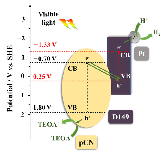 Based upon the above characterizations of the catalyst, a possible photocatalytic mechanism is proposed (Figure 10). The bandgap values of pCN and D149 dye can be calculated through the following equation [68]: