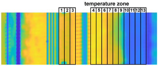 For process documentation, the temperature matrices are saved every hour. The selected time periods contain on the one hand constant process conditions over several days and on the other hand melting processes. For further processing, the temperature matrix is divided into individual temperature zones along the longitudinal axis of the rotary kiln. Figure 2 shows the partition in different temperature zones. At date t and in zone z, the mean kiln-shell temperature is defined as .