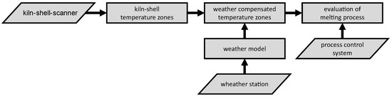 The kiln-shell-scanner data represent an essential source of information for the plant operator to evaluate the zink recycling process. In a first step, described in Section 4.1, data disturbances need to be identified and eliminated. Subsequently, in Section 4.2, the corrected data can then be used for extended analysis, such as the melting process. Figure 3 shows the flow diagram of the data processing presented in this paper.