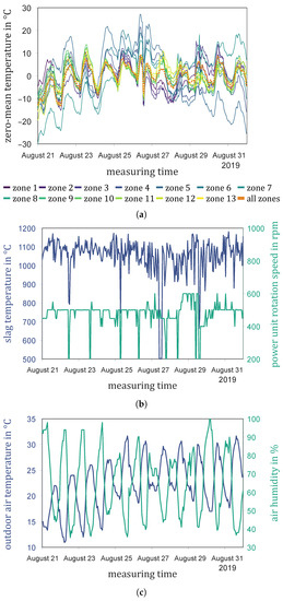 In order to identify data disturbances, the zero-mean temperature profile of the defined temperature zones is examined for time periods with almost constant process conditions (Figure 4a). For example, the slag temperatures vary steadily between 1000 –1200 and the rotation speeds of the kiln power unit between 400 –600 , as shown in Figure 4b.