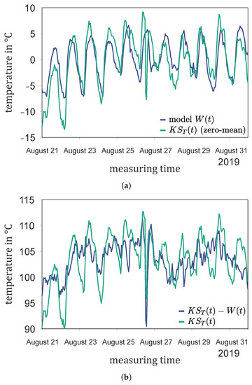 Figure 5a visualizes the comparison of weather model and zero-mean measured data for the 10 days in August selected for parameter estimation and Figure 5b shows the comparison between the measured kiln-shell temperatures and the kiln-shell temperatures corrected by the weather-related part .
