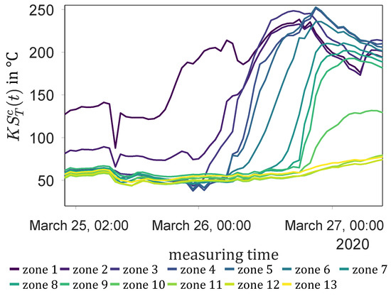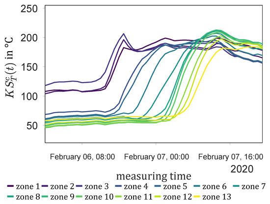 An analysis of kiln-shell temperature according to Section 4.2 is executed for the melting process in February 2020 (Figure 6) and for another one on the same kiln in March 2020 (Figure 12).