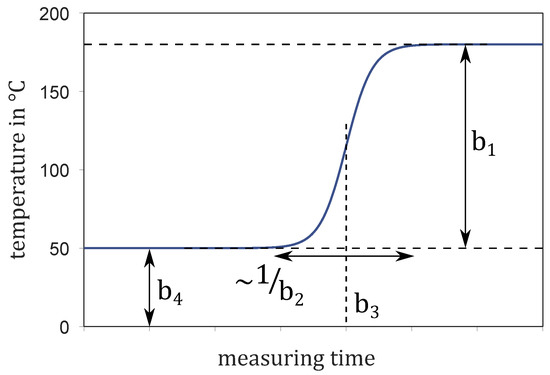 The parameters can be read directly from the sigmoid function (Figure 7) and interpreted as physical quantities of the melting process. describes the temperature rise, the duration, the inflection point, and the temperature at the beginning of the melting process. For the identification of the parameters based on current measurement data, it makes sense to define reasonable parameter ranges and initial values. The ranges and initial values can be determined to be empirically based on historic data and expert process knowledge. For the temperature rise , there is a range between 40 and 250 , for the inflection point , the time range between the beginning of the melting process and 72 h later, and, for the start temperature , a range between 30 and 150 is given. The range of values for parameter is defined between 0.2 and 3 and is inversely proportional to the melting duration. has the current temperature at the beginning of the melting process as an initial value. The remaining initial values can be selected from the specified ranges.