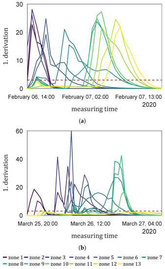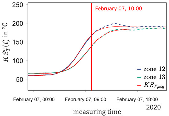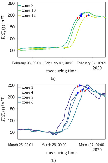 For the melting processes in February and March 2020, the optimal end point of the melting process could be correctly and automatically recognized for all zones. For three zones in February and four zones in March, it was even possible to predict the end point between one to three hours in advance. Figure 14 shows the profile of the temperature for these zones with the associated times of stable sigmoid estimation (red diamond) and the calculated end of the melting process from this date (blue star). The end of the melting process is a forecast for the selected temperature zones; for the remaining zones, not shown, the end of the melting process corresponds to the point in time of stable sigmoid estimation.