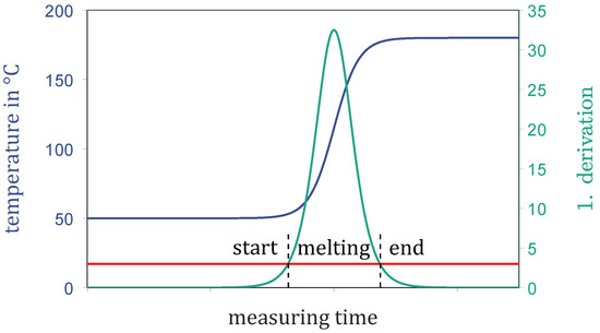 shows how far the melting process has progressed and even the probable end can be predicted. For this, empirical conditions for the end are specified. On the one hand, a previously defined temperature rise must have been reached compared to the start of the melting process. On the other hand, the inflection point of the sigmoid function has to be exceeded and a minimal derivation (Figure 9, red line) has to be reached: