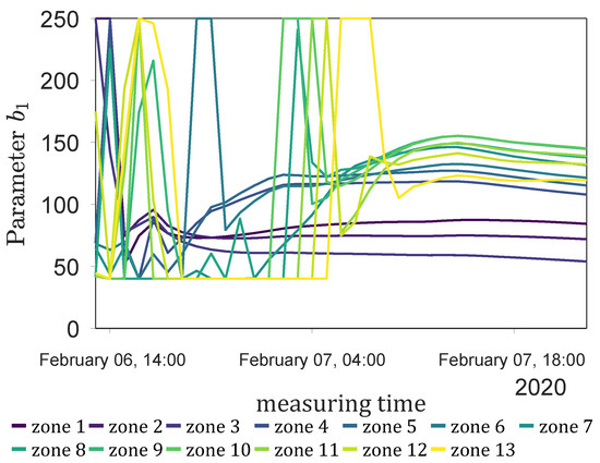 The sigmoid estimation of a zone is trusted as soon as the parameters converge to a nearly constant value within the limits for . Figure 10 shows an example of the temporal profile of the parameter for the melting process from Figure 6. During the melting process, the parameters of the estimated sigmoid functions reach a constant value and thus a reliable sigmoid estimation.