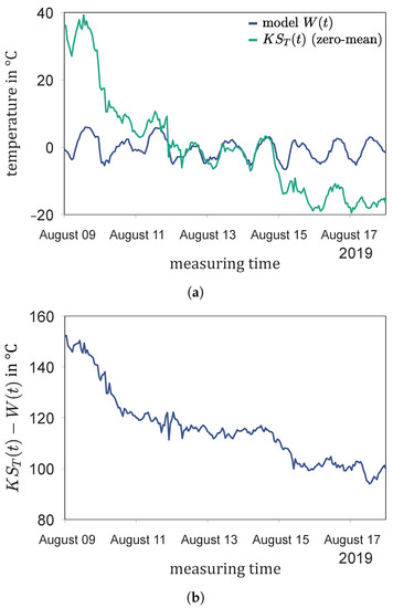 In addition to the apparent similarity of the temperature profiles (see Figure 4a,c), we consider the correlation coefficients between the mean kiln-shell-scanner temperature of all zones and the outdoor air temperature. A correlation coefficients is characterized by values in the range between −1 to 1. The value 0 refers to no correlation, 1 corresponds to a high positive, while to high negative correlation. The correlation coefficient between the mean kiln-shell scanner temperature and the outdoor air temperature results in a value of , implying a positive correlation and the coefficient between the mean kiln-shell scanner temperature and the air humidity a value of implying a negative correlation.