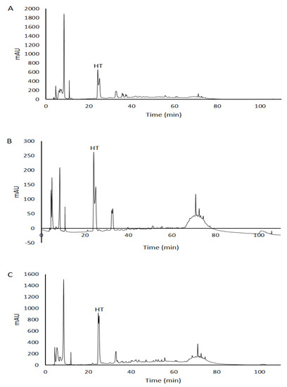 Chromatographic profile of OOD extracts from Basso (A), Dell’Orto (B), and EVO (C) oil mills. OOD were extracted according to Method 1–acidified methanol, as described in Section 2.3. HT: hydroxytyrosol.
