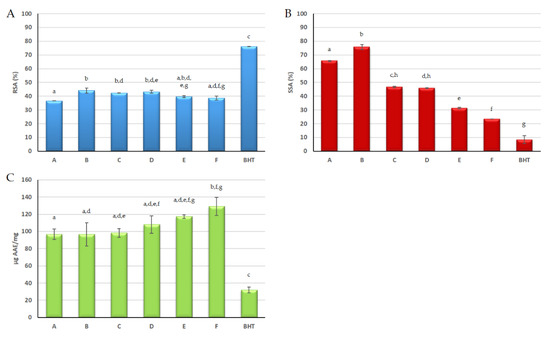 Antioxidant power of OOD extracts prepared by Method 3. Radical Scavenging Activity—RSA (A), Superoxide Scavenging Activity—SSA (B), Ferric Reducing Antioxidant Power (C). BHT: butylatedhydroxytoluene; AAE: Ascorbic Acid Equivalents. Bars with the same letter indicate not significant differences at p > 0.05.